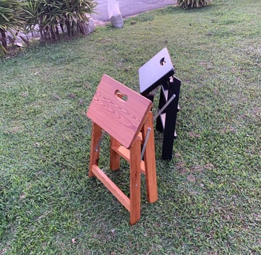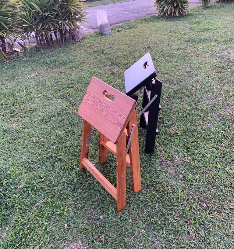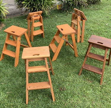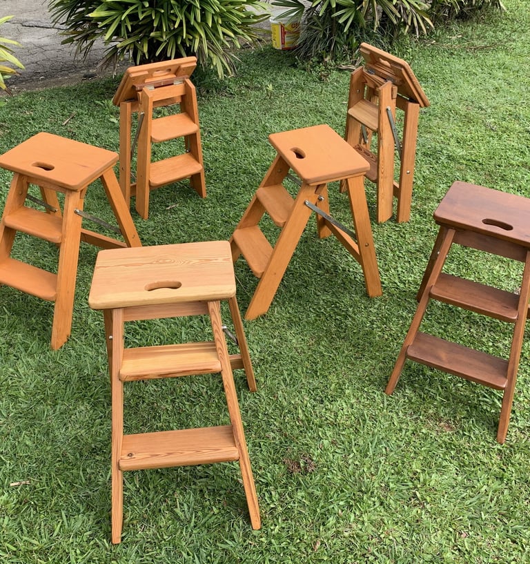 Escadinhas dobráveis com 3 degraus em madeira maciça - com 52 cm de altura, ideal para alcançar aquele andar de cima do seu armário ou da sua cozinha. Valores a partir de R$ 1.850 reais